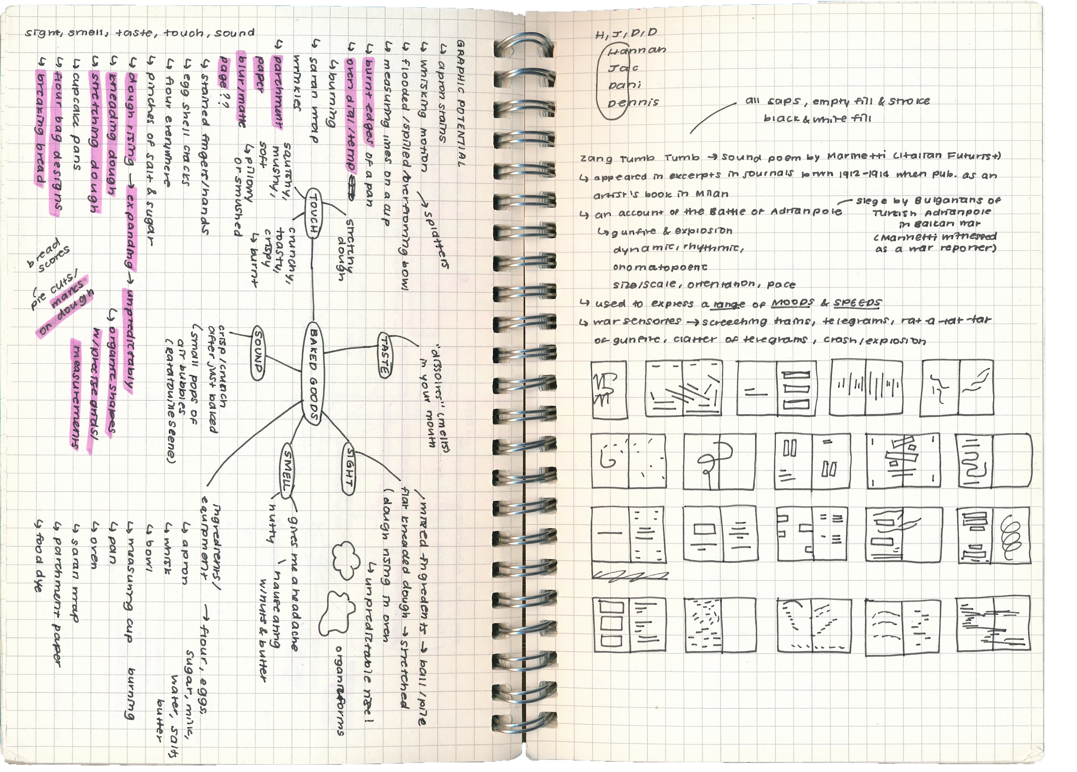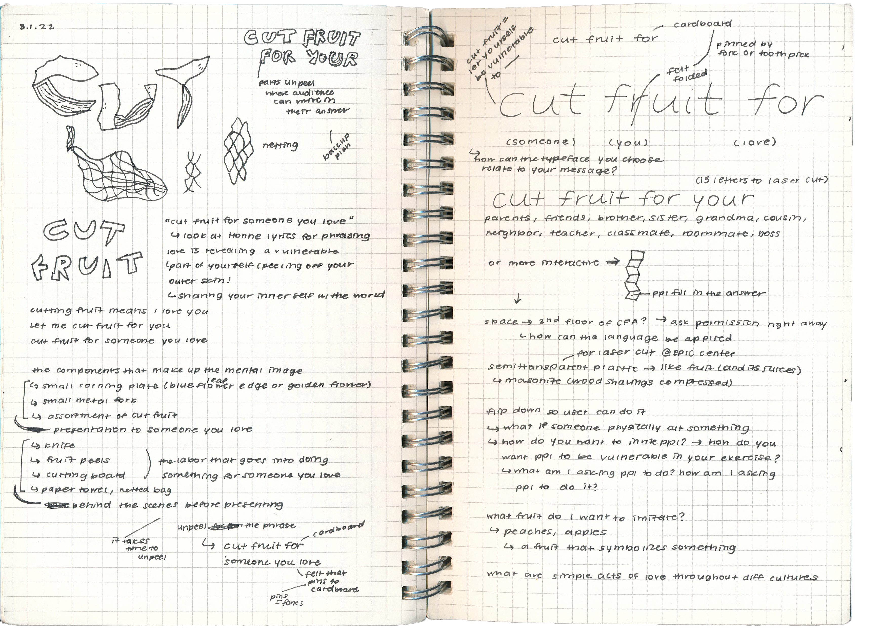 The first step in my design process is always writing in my design notebook. My flow of thoughts and research materialize onto the pages in the form of mindmaps, diagrams, thumbnails, sketches, and lists.